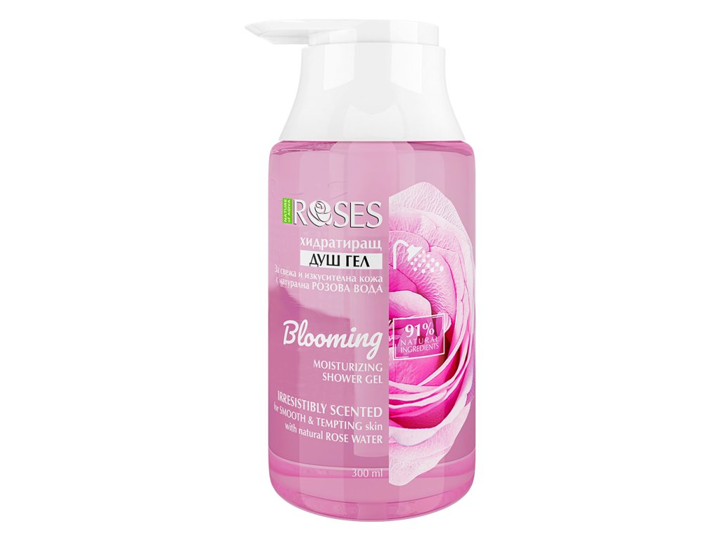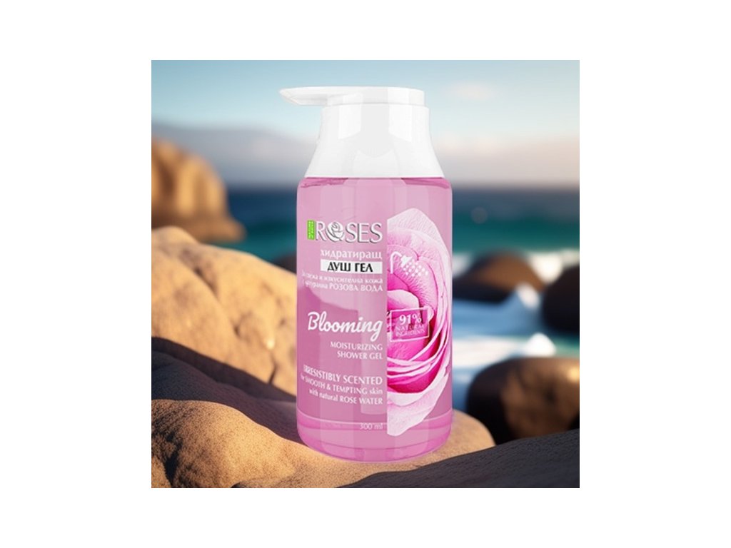 ROSES Hydratačný sprchový gél s prírodnou ružovou vodou pre sviežu a hydratovanú pokožku. Objem 300ml - 30,67€/1l