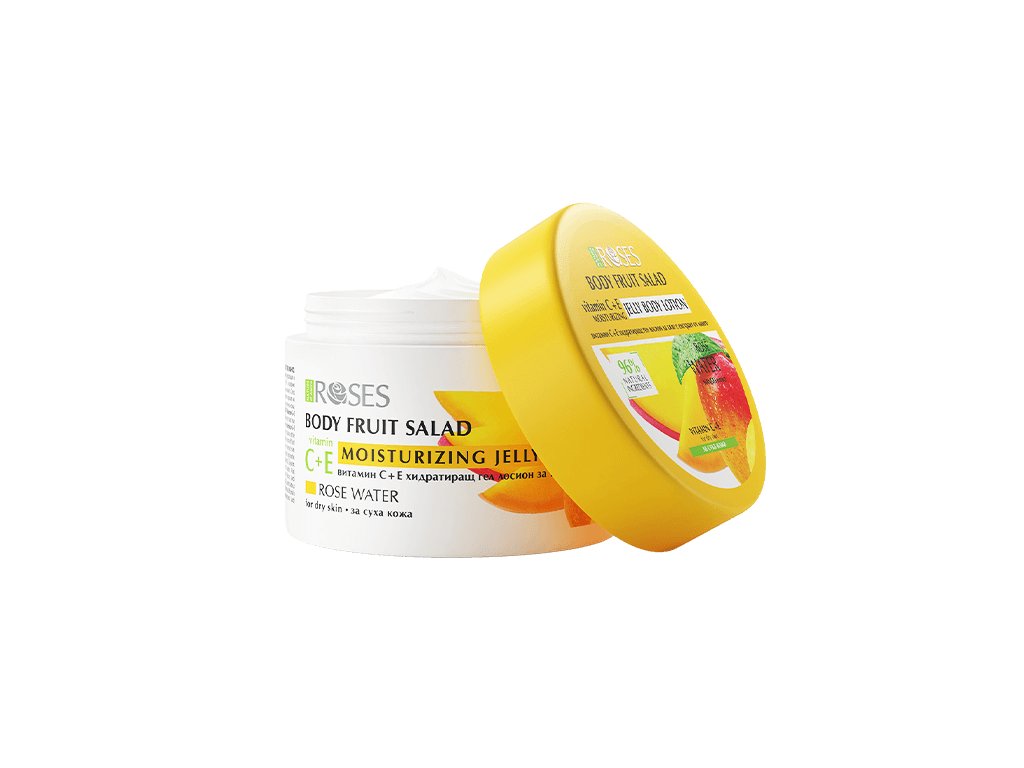 FRUIT SALAD Vitamín C+E hydratačné gélové telové mlieko s mangom poskytuje intenzívnu hydratáciu a výživu suchej pokožke vďaka 96 % prírodných zložiek. Vitamíny C a E podporujú regeneráciu pokožky a tvorbu kolagénu, zatiaľ čo ružová voda a ovocné extrakty z manga, kiwi a avokáda zjemňujú, vyhladzujú a dodávajú pokožke svieži ovocný aroma. Ľahká, rýchlo sa vstrebávajúca textúra zanecháva pokožku hebkú, pružnú a komfortnú pri každodennom používaní.