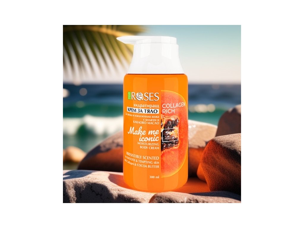 ROSES COLLAGEN RICH telový krém s kolagénom a kakaovým maslom pre sviežu a hladkú pokožku. Hĺbkovo hydratačná starostlivosť s prírodnou ružovou vodou a 96 % prírodným zložením, ktorá okamžite obnovuje elasticitu pokožky, posilňuje spojivové tkanivo, spevňuje a zlepšuje kontúry, pričom jej dodáva svieži a žiarivý vzhľad. S neodolateľnou vôňou šťavnatej papáje a praktickou pumpičkou pre jednoduché použitie.