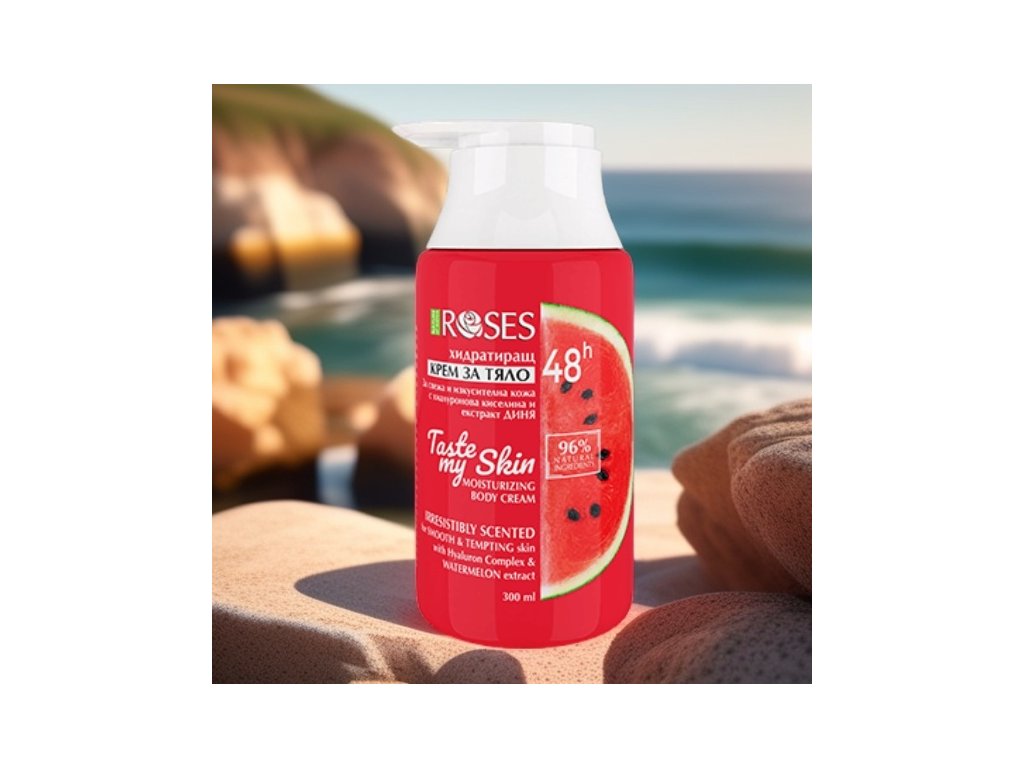 ROSES Hydratačný telový krém pre optimálnu 48-hodinovú hydratáciu a výživu. So zvodnou vôňou a extraktom z melóna pre sviežu a neodolateľnú pokožku. Prírodná formula obohatená o kyselinu hyalurónovú a ružovú vodu s 96 % prírodným zložením. Okamžite sa vstrebáva, obnovuje komfort a elasticitu pre hodvábne hladkú a jemnú pokožku. S neodolateľnou vôňou sviežeho melóna a praktickou dávkovacou pumpičkou pre jednoduché použitie.